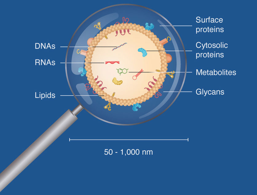 Extracellular vesicles (EVs) are small, membrane-bound particles continuously released by living cells throughout their lifespan. The cargo of EVs are not exported randomly; they reflect the health status of their parental cells and are enriched with bioactive components involved in critical cellular functions. EVs serve as convenient 'windows' into cellular processes, generally transmitting specific intercellular messages regionally and across organs. When a blood sample is taken, it contains billions of these EVs including hundreds of thousands derived from specific organs like the liver. For more visual explanations, please watch our 3D video.